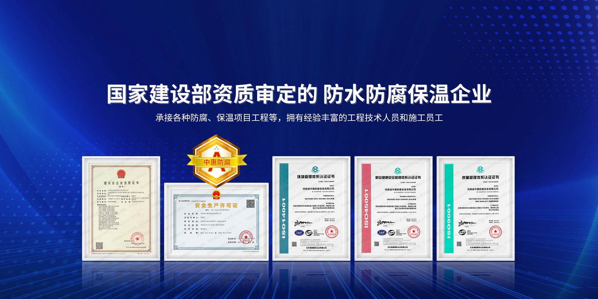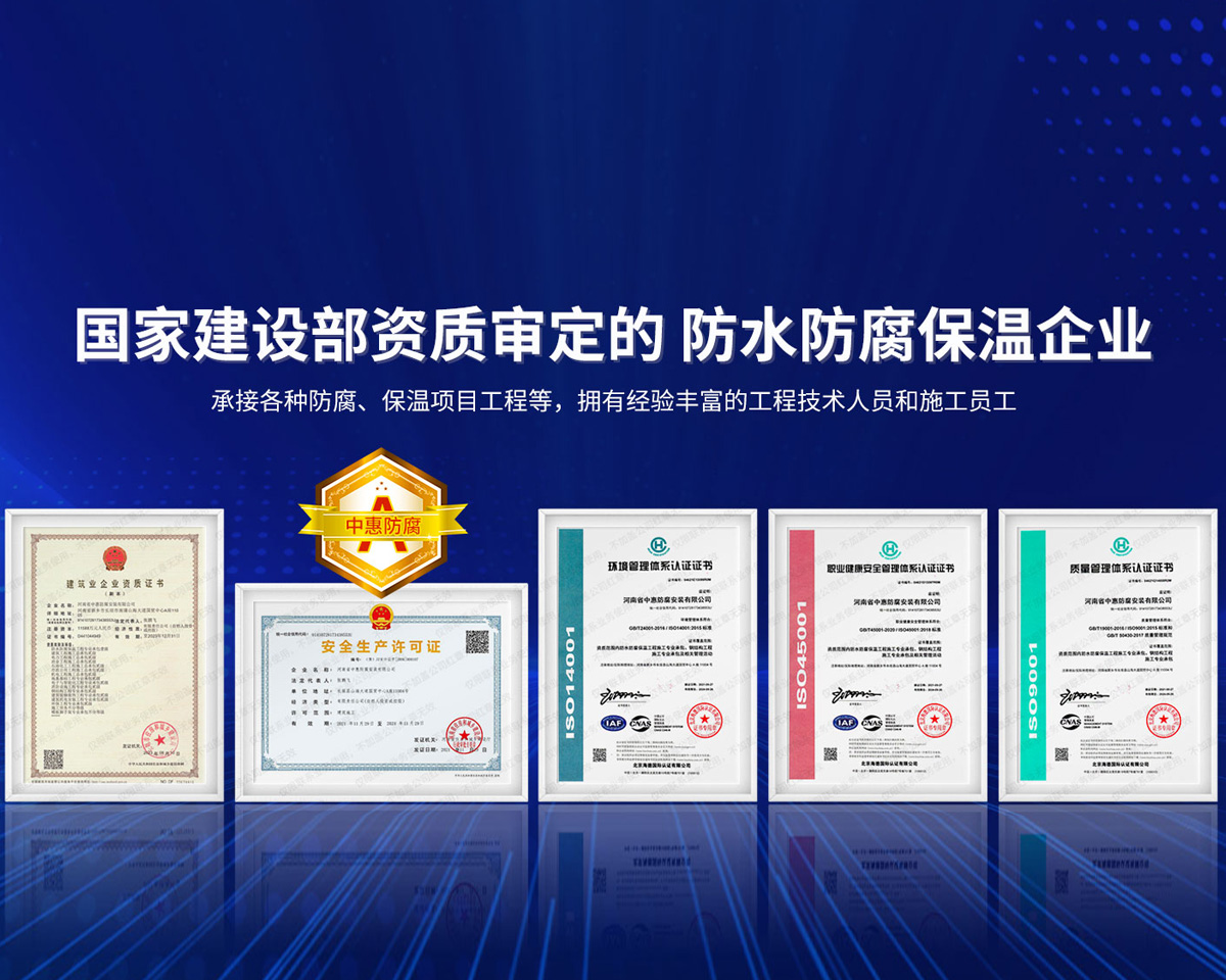 公司經營范圍:防水防腐保溫工程;消防設施工程;建筑裝修裝飾工程;建筑機電安裝工程;電力工程;建筑工程;石油化工工程;工業清洗工程;油罐清洗工程;鋼結構工程;環保工程;模板腳手架工程;電纜防火封堵、防污閃噴涂、外墻外保溫工程;各類施工勞務作業;設備維修、船舶鉚焊、涂裝;電力工程材料、建材、防水材料、防火材料、防腐保溫材料銷售,并相繼通過了GB/T19001-2008idtISO9001:2008GB/T50430-2007質量管理體系認證證書。GB/T24001-2004idtISO14001:2004環境管理體系認證證書。GB/T28001-2011idtOHSAS18001:2007職業健康安全管理體系認證證書。公司是中國防腐蝕于防護協會、中國施工企業管理協會、電力協會和中國鋼結構防水協會會員單位。 公司的經營業務涵蓋了石油、化工、電力、冶金、煤炭、船舶、國防、燃氣、水利、環保、交通運輸、航空及國防軍工和輕紡市政等行業的防腐保溫絕熱設備。鋼結構安裝、防火、防水、金屬噴鍍、聚脲噴繪、陰極保護、防滲透堵漏、玻璃鋼及各種磚版材料襯里、橡膠襯里、煙氣硫和耐酸溶劑腐蝕等工程施工。公司連續十年榮獲“省市先進施工企業”“安全生產先進單位”“重合同,守信用企業”和“AA***資質企業”的稱號。2000年被命名為市級文明單位,2002年被國家工商行政管理局命名為“重合同,守信用的企業”、被中國工業防腐蝕技術協會命名為“防腐蝕企業,能源節約及環境保護領域有豐富的經驗和***的業績。工程一次交驗合格率100%。其中攀枝花鋼鐵公司煉鐵廠四號高爐及熱風爐防腐工程、上海寶鋼公司煤氣柜防腐工程、撫順石油一廠裝置防腐項目、齊魯石化公司稀烴廠高塔防腐工程、吉林化學工業公司煉油廠油罐防腐工程、天津石化熱電廠六號爐頂棚聯絡管保溫工程、大慶油田(太倉)力神泵業工程、中國化學工程第十一建設工程、中原油田勘探局工程、中國石化銷售有限公司華北分部、魯皖輸油管道工程、貴州開磷息烽合成氨工程、陜西黃陵煤化工程、中國石油天然氣西部管道塔里木輸油工程、邯鋼集團邯寶鋼鐵公司煉鐵工程、德州供電工程、吉寶(南通)船廠工程,偃師華潤熱力工程、鄭州熱力總公司。 河南省中惠防腐安裝有限公司愿以豐富的施工經驗,***的技術,***的設備,***的管理,***的服務,竭誠為國內外廣大的用戶提供***滿意、******的工程作品。 我公司愿與國內外同仁一道,團結協作,共同推進防腐蝕行業發展! 公司地址:河南省長垣縣建設路北段360號 固定電話:0373-8866488 郵編:453400 網址:http://www_zhff_com_cn.njkckj.com